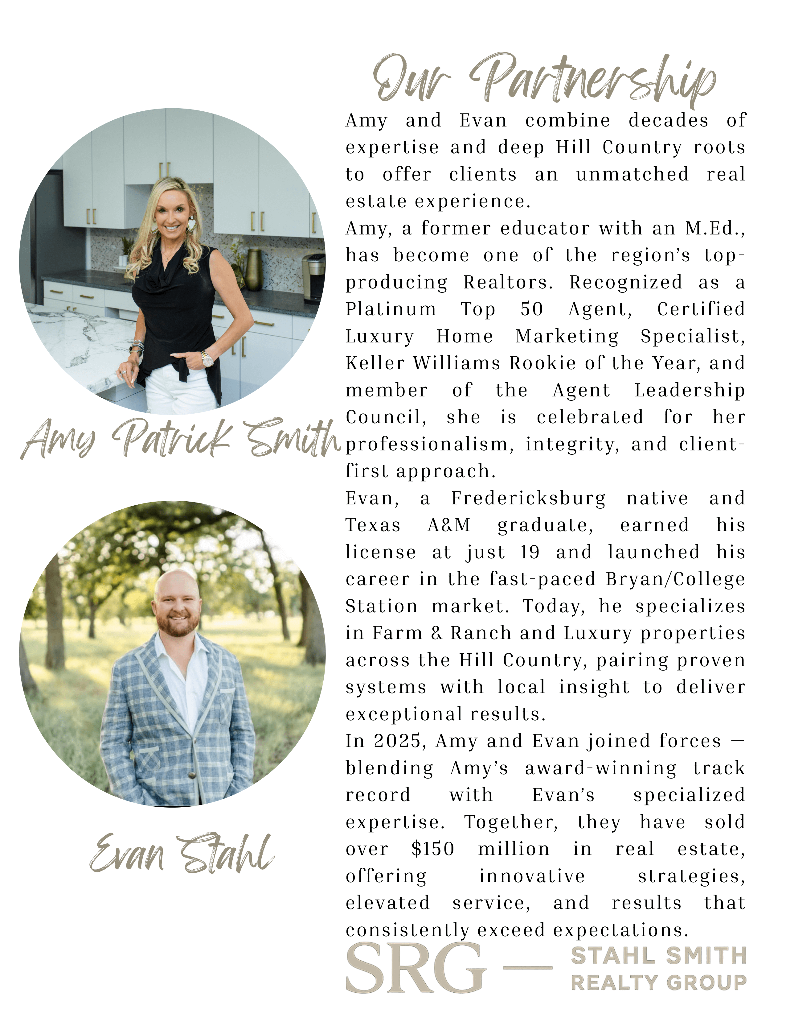 In 2025, Amy expanded her business by joining forces with a Fredericksburg native Evan Stahl specializing in Farm & Ranch and Luxury properties — a partnership that enhances the level of local expertise and specialized service available to her clients. Together, they bring unparalleled knowledge of the Texas Hill Country, from luxury estates to wide-open ranch land.